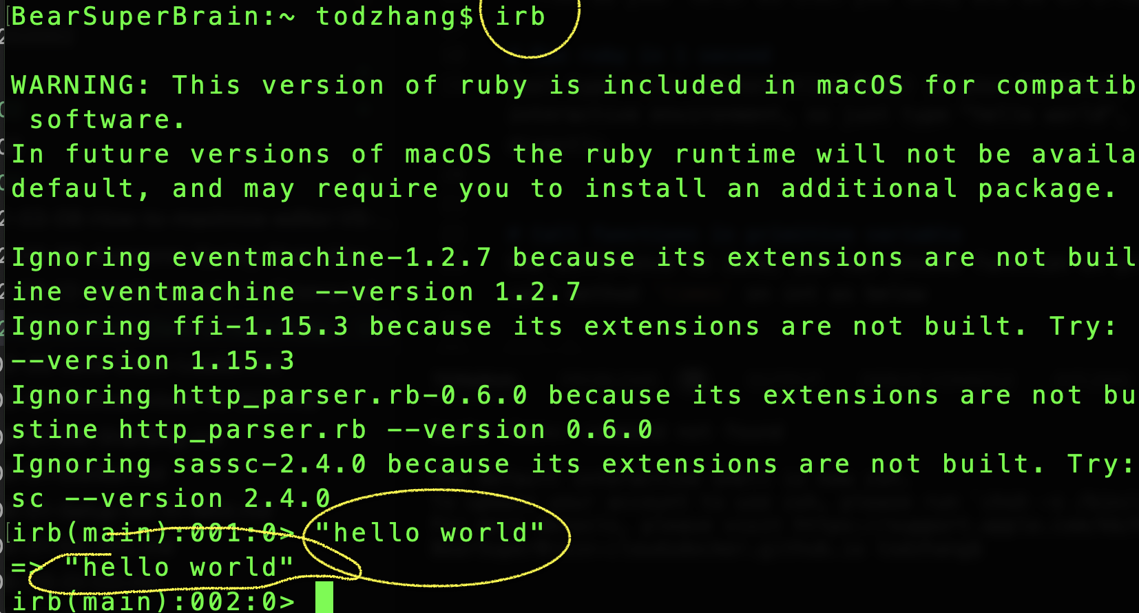 Just type irb (Interactive Ruby) in your terminal, you’ll get get a Ruby interactive environment, so just type “hello world”, you’ll see the result directly.
