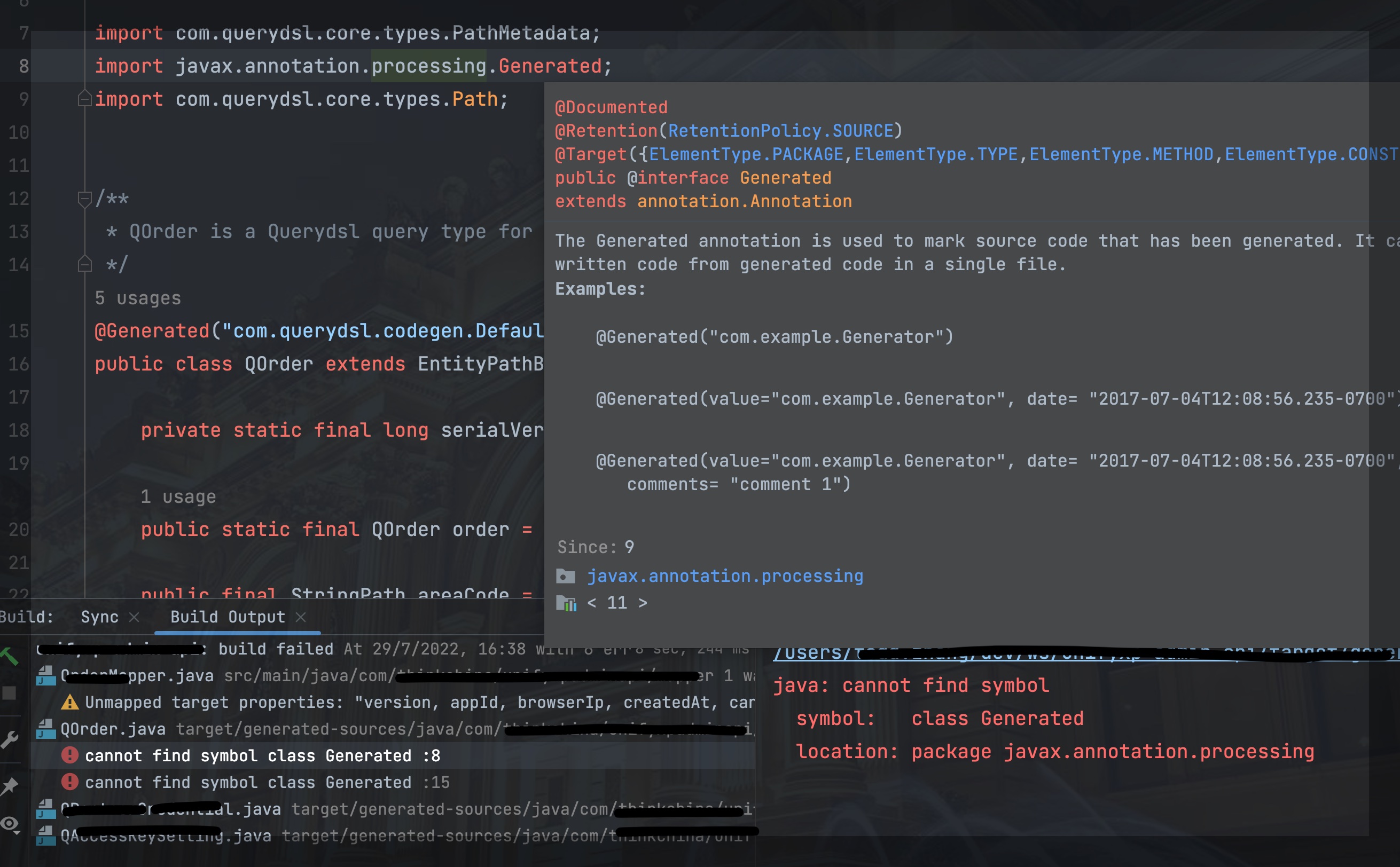 However, if you getting errors in thsoe generated class, such as cannot find symbol calss Generated, this is acatualy one class in javax.annotation.processing package.