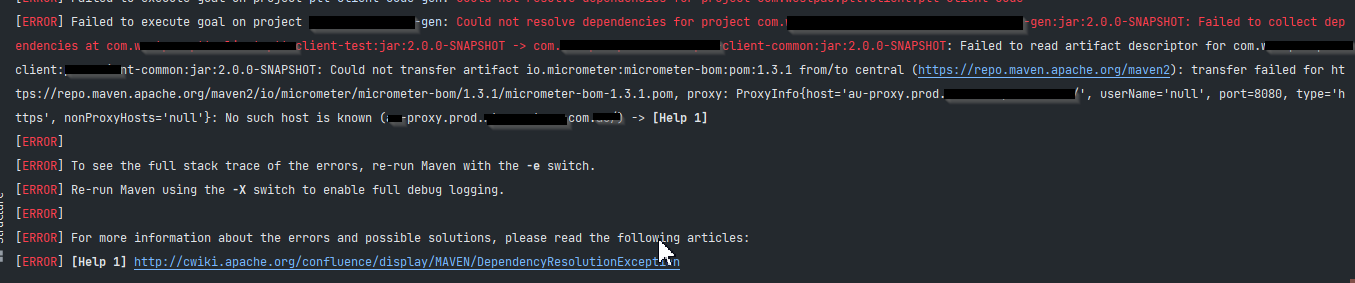 Caused by: org.eclipse.aether.transfer.ArtifactTransferException: Could not transfer artifact io.micrometer:micrometer-bom:pom:1.3.1 from/to central (https://repo.maven.apache.org/maven2): transfer failed for https://repo.maven.apache.org/maven2/io/micrometer/micrometer-bom/1.3.1/micrometer-bom-1.3.1.pom, proxy: ProxyInfo{host='proxy.stgeorge.com', userName='null', port=8080, type='https', nonProxyHosts='null'}