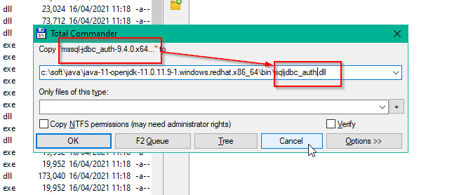 Lastly, copy your platform dill file (e.g. mssql-jdbc_auth-9.4.0.x64.dll) and rename to sqljdbc_auth.dll